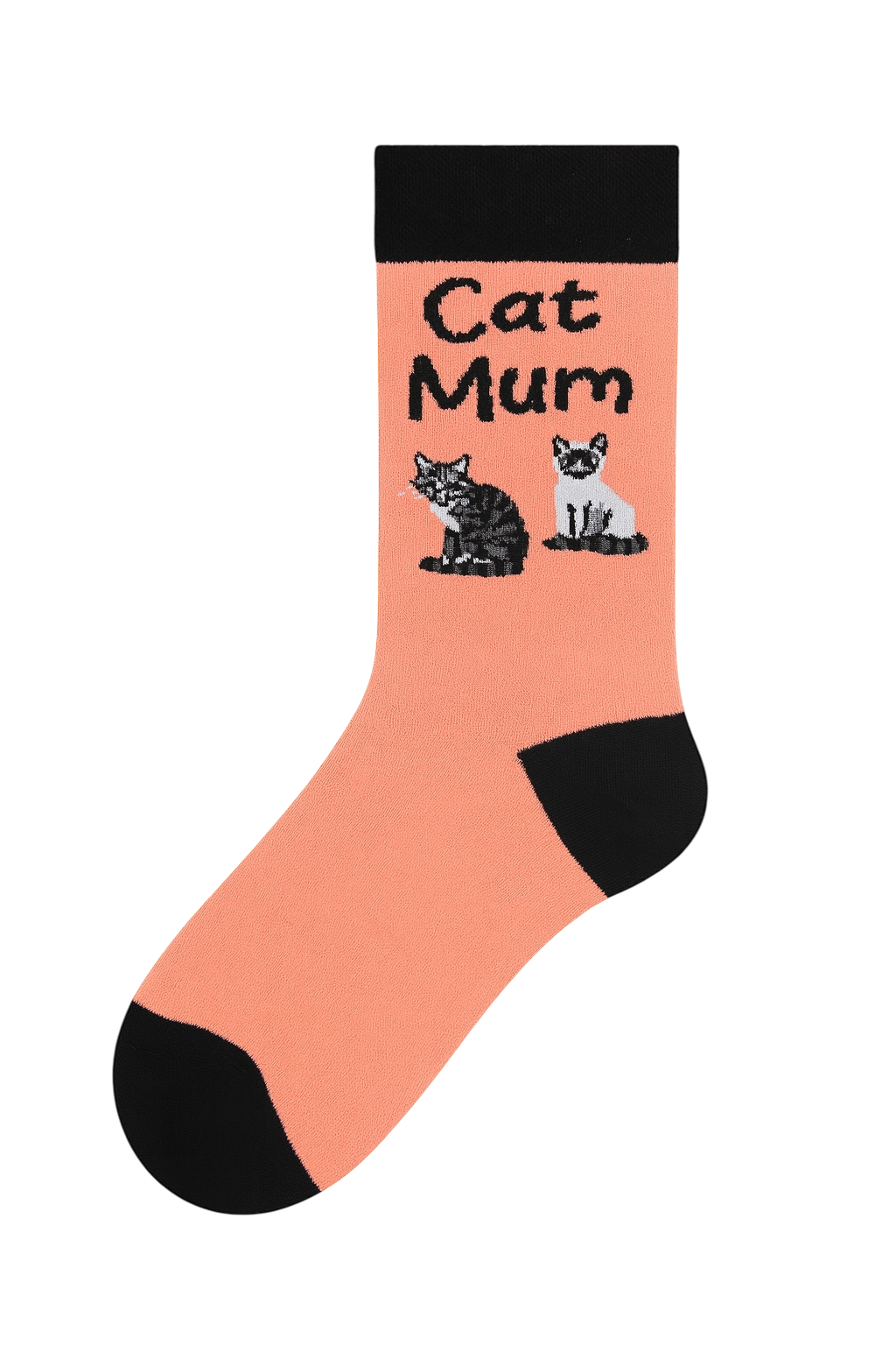 Cat Mum: A soft peach/coral sock celebrating the 'Cat Mum' title with cute kitten portraits.
